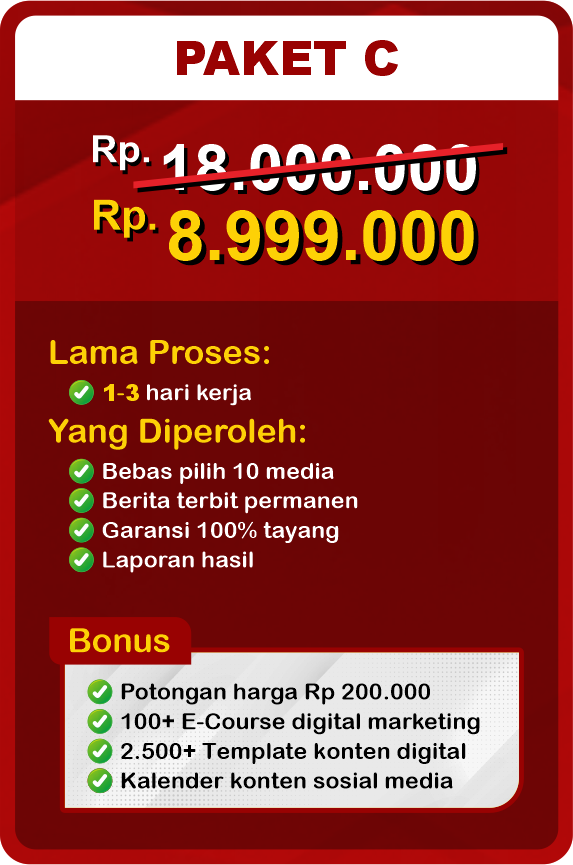 Kami menawarkan beberapa pilihan paket press release, masing-masing dengan jumlah media penerbitan yang beragam. Anda bisa memilih paket sesuai kebutuhan atau menentukan jumlah penerbitan sendiri. Untuk bantuan lebih lanjut, konsultasi gratis tersedia.